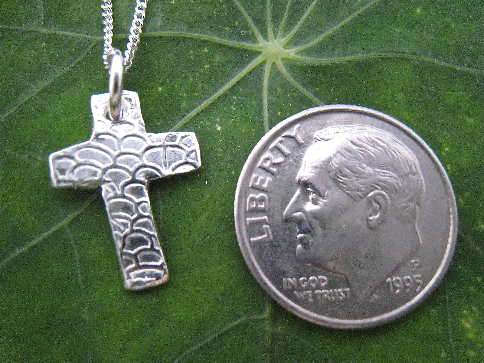 Each handcrafted fine silver (.999) cross is one-of-a-kind like you and me. It is the perfect unique gift for a First Holy Communion, Baptism, Confirmation, or just because you like the cross. The cross is reversible and has a different texture on the back. The necklace comes with a small Initial charm and a Swarovski Crystal Birthstone.
